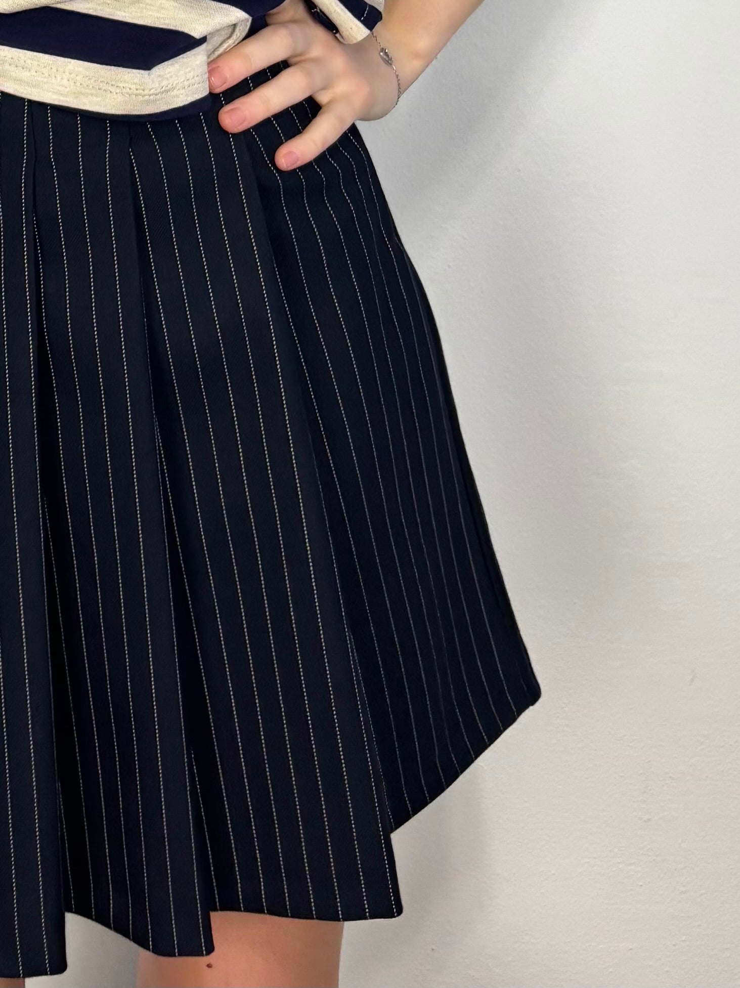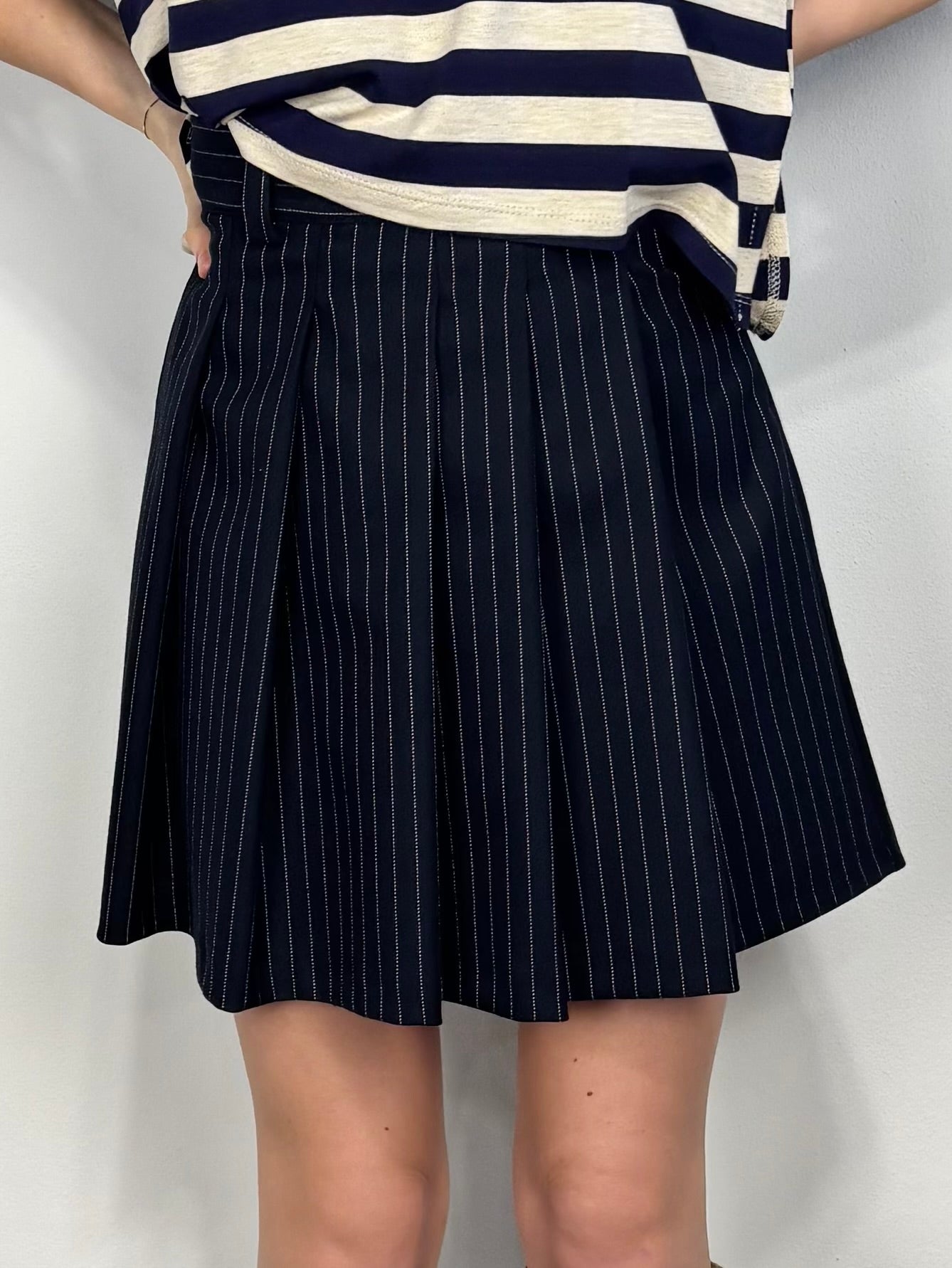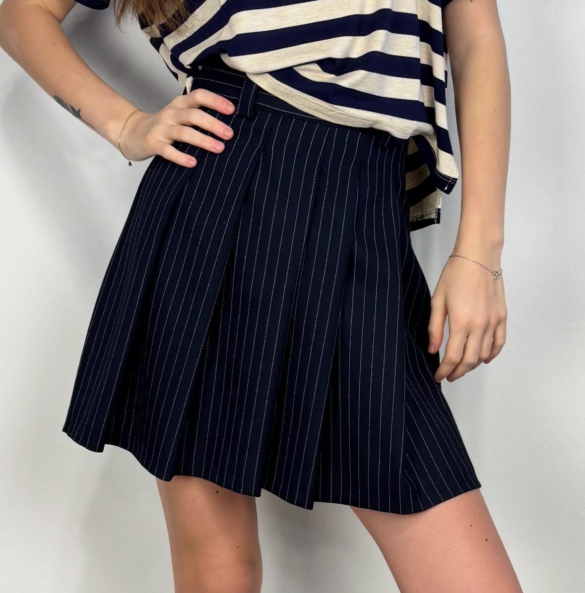 Gonna corta e pieghe gessata blu.