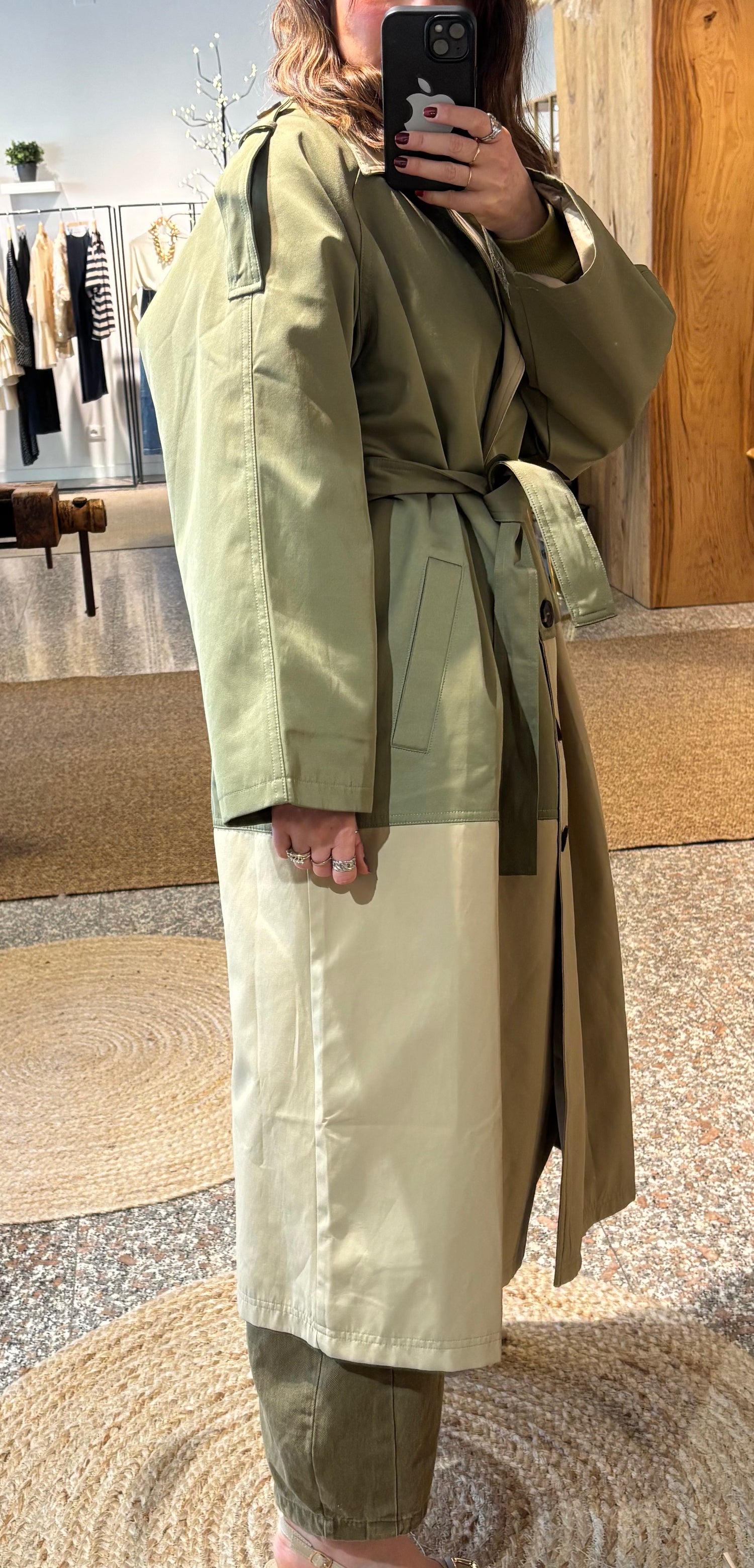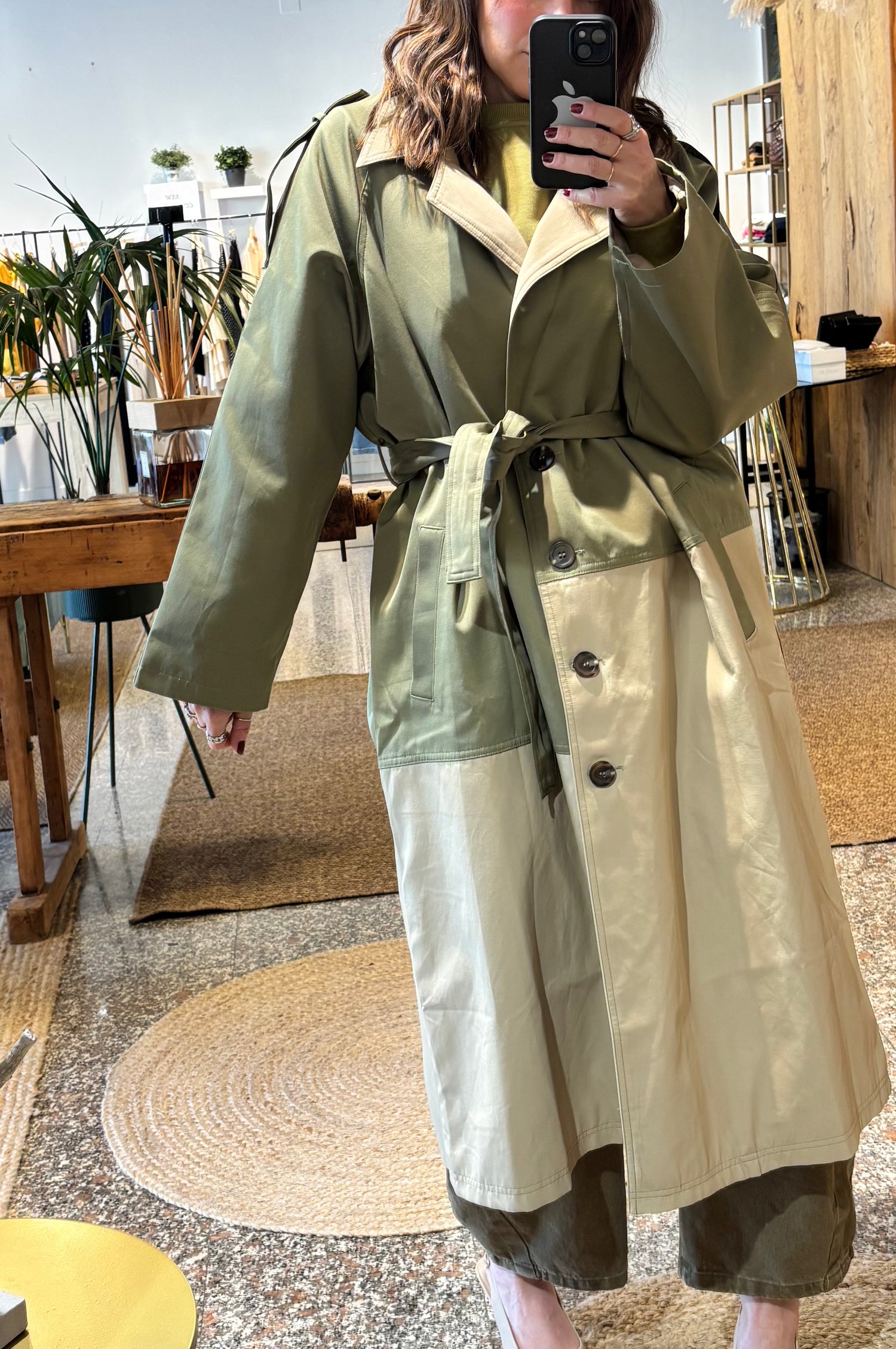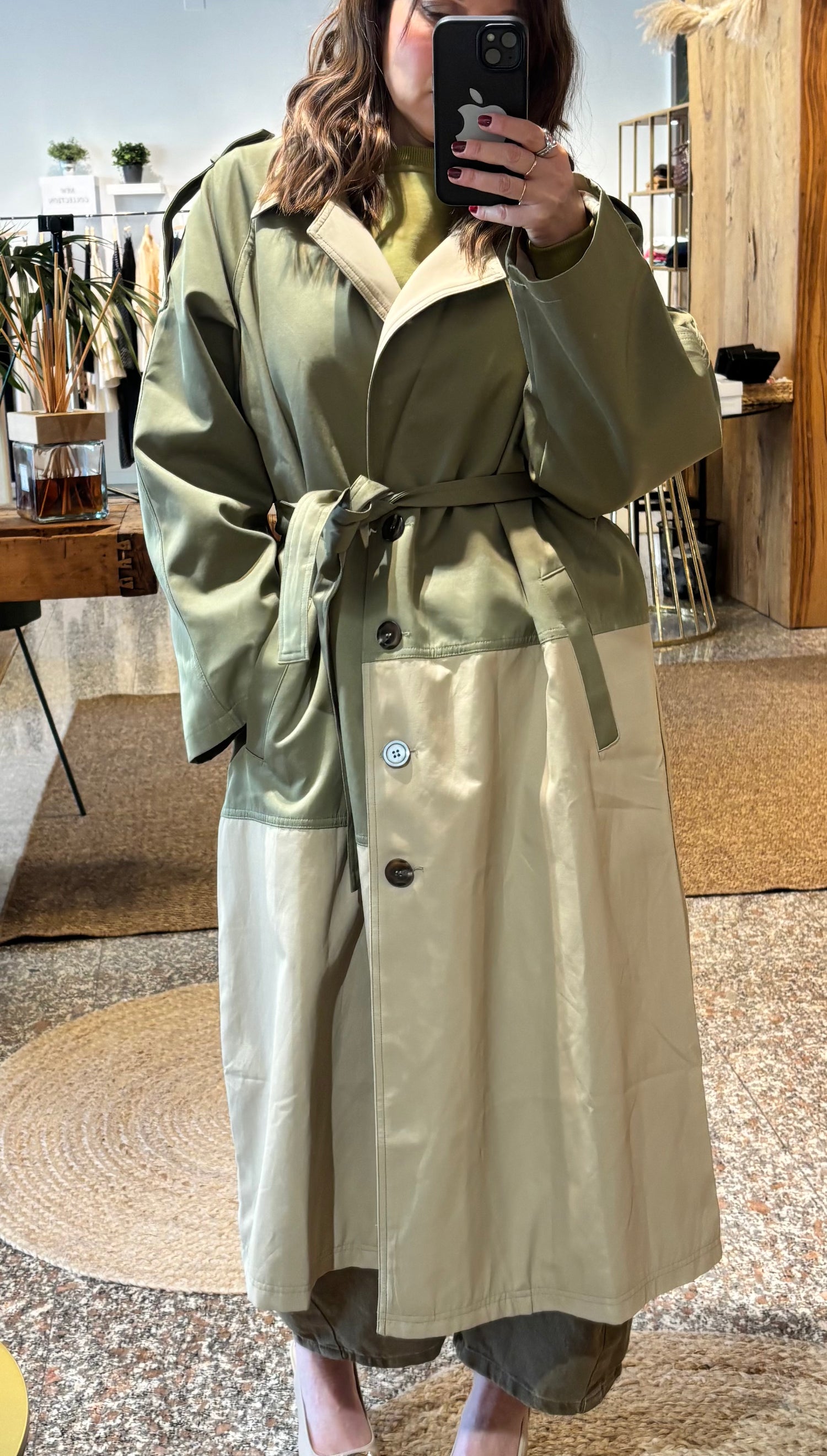 Trench bicolore beige/verde militare lungo con collo revers e fusciacca in vita.